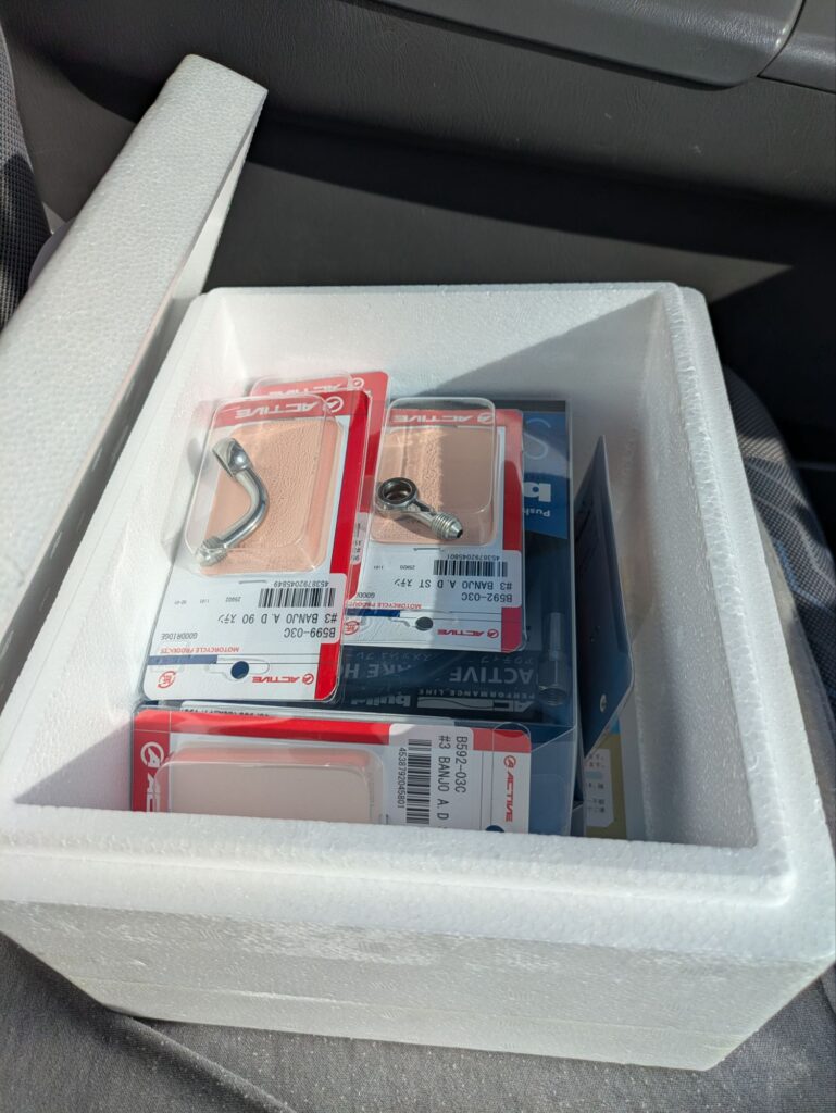 カタナのブレーキ廻りを組むのにブレーキパーツを色々調達して 何パターンか試して具合が良いのに決める為  つい余分に仕入れておきます✨あれば便利ですからね  保冷ボックスに入れてくれました😊
